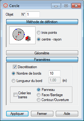 L’option Créer les barres n’est disponible que si l’option Discrétisation est sélectionnée. Si vous cochez cette option, le cercle sera composé d'éléments de type barre (les parties individuelles d'un cercle seront des barres).