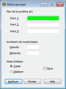 Si le mode d’accrochage Grille ou Auto a été sélectionné, dans les champs d’édition Point 1, Point 2 et Point 3 sont affichées les coordonnées des points définissant le plan du miroir. Si le mode d’accrochage actif est Nœud, dans les champs d’édition Point 1, Point 2 et Point 3 sont affichés les numéros des nœuds définissant le plan du miroir.