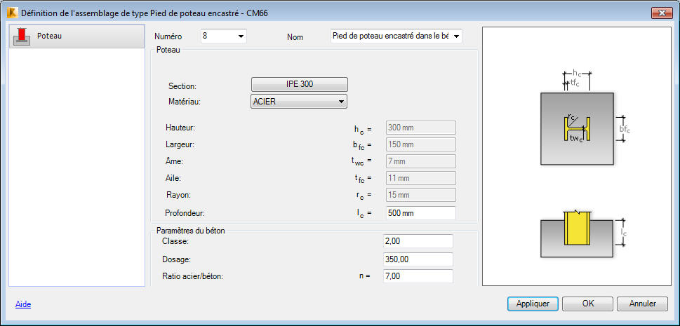Sur cet onglet, vous pouvez définir les paramètres du poteau (la section et le matériau).