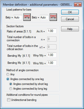 - Méthode de connexion de l'angle - l'option permet de déterminer si une barre d'angle est fixée aux autres composants de structure par une jambe ou de toute autre façon ; pour les barres de compression en angle fixées par une jambe, la résistance de l'acier est réduite par le programme selon les directives du point 3.2.2.1 de la norme.