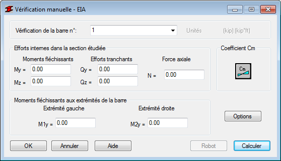La boîte de dialogue Vérification manuelle sert à effectuer la vérification manuelle de la barre acier pour les valeurs des efforts internes définies par l’utilisateur suivant la norme américaine EIA (Design of Steel Transmission Towers). Cette boîte de dialogue est accessible en cliquant sur Dimensionnement Dimensionnement des barres en acier - options Vérification. Le logiciel affiche la boîte de dialogue ci-dessous :
