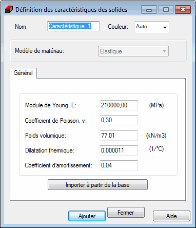 Cliquez sur le bouton Importer à partir de la base de données pour ouvrir la boîte de dialogue auxiliaire dans laquelle vous pouvez sélectionner un matériau disponible dans les bases de données. Après la sélection du matériau, les paramètres sont saisis dans les champs correspondants de la boîte de dialogue Définition des propriétés des solides.
