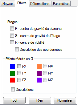 Dans cette boîte de dialogue, vous pouvez sélectionner les efforts réduits (FX, FY, FZ, MX, MY, MZ) pour les présenter ; les efforts et les moments sont réduits au centre de gravité de chaque étage pour un cas donné. Pour chacune des valeurs indiquées ci-dessus, la couleur et la description appropriées peuvent être sélectionnées.