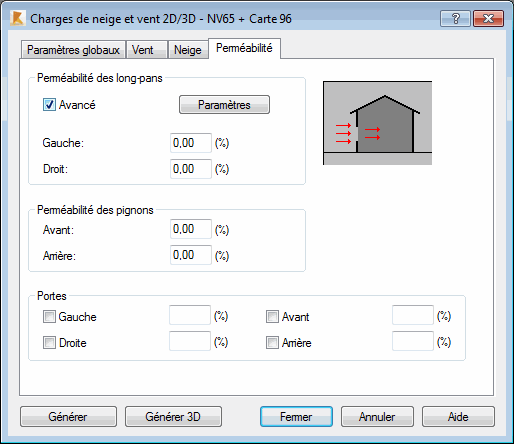 Lorsque vous ouvrez la boîte de dialogue Charges de neige et vent et cliquez sur l'onglet Perméabilité, la boîte de dialogue suivante s'affiche.