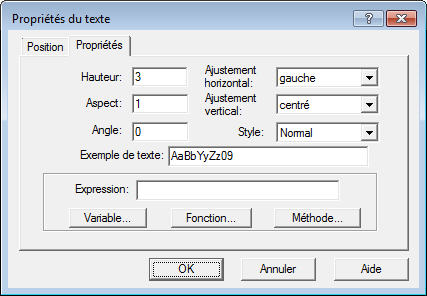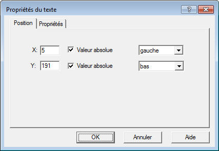 La boîte de dialogue comporte deux onglets : Position et Propriétés. Le dessin ci-dessous présente l'onglet Position de la boîte de dialogue Propriétés du texte.