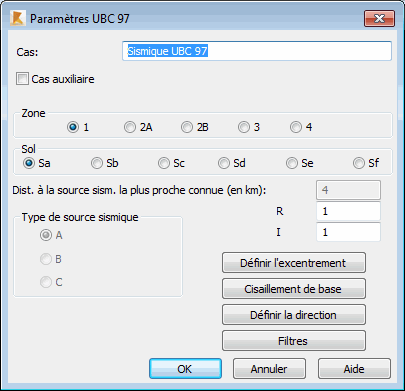 Les paramètres de l’analyse sismique des structures dépendent de la norme parasismique sélectionnée pour le calcul des structures sollicitées par des charges sismiques. Sélectionnez la norme sismique américaine UBC 91 ("Code uniforme pour le bâtiment 1991") dans la boîte de dialogue Définition d'un nouveau cas ou cliquez sur Paramètres dans la boîte de dialogue Type d’analyse.