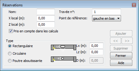 Si vous utilisez le menu ou la barre d’outils pour appeler l’option en question, seule la boîte de dialogue est affichée, la boîte de dialogue Ouvertures est un outil de base de définition des ouvertures dans la poutre.