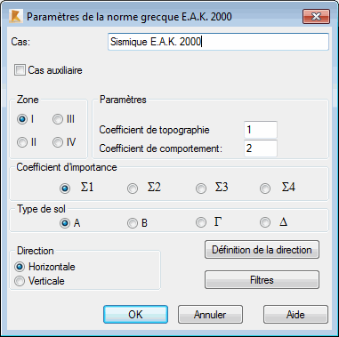 Les paramètres de l’analyse sismique des structures dépendent de la norme parasismique sélectionnée pour le calcul des structures sollicitées par des charges sismiques. Sélectionnez la norme grecque E.A.K. 2000 ou E.A.K 2000/2003 dans la boîte de dialogue Définition d'un nouveau cas ou cliquez sur Paramètres dans la boîte de dialogue Type d'analyse.