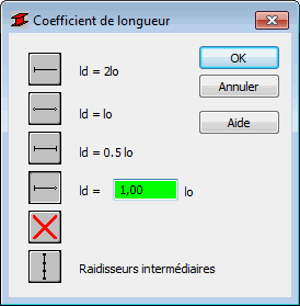 Les modèles de déversement type qui déterminent les valeurs de coefficient de longueur de déversement se trouvent dans la boîte de dialogue qui s’affiche. Vu que l’aile inférieure et l’aile supérieure peuvent être montées séparément et que dans les cas de charge différents les contraintes de compression peuvent apparaître dans l’aile supérieure ou dans l’aile inférieure, on distingue deux longueurs de déversement. On définit le coefficient multiplicateur de la longueur de base de la barre pour obtenir la longueur de flambement. Comme longueur de base on prend la longueur lz. La valeur du coefficient peut être saisie manuellement ou en appuyant sur l’icône du modèle de déversement type qui affecte automatiquement les coefficients appropriés.