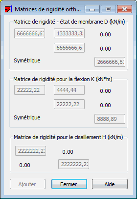 Une fois sélectionnés les types de géométries de dalle prédéfinis dans la liste de la boîte de dialogue Nouvelle épaisseur, cliquez sur Affichage pour ouvrir la boîte de dialogue Matrices de rigidité - Orthotropie contenant les valeurs de matrice de rigidité calculées. Tous les champs de la boîte de dialogue sont désactivés. De plus, l'option Epaisseur équivalente est désactivée et les champs d'édition pour la définition de l'épaisseur sont inaccessibles.
