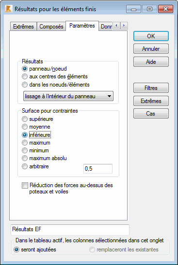 Dans la partie Surface pour contraintes - Supérieure, Moyenne, Inférieure, Maximum, Minimum, Maximum absolu et Arbitraire (les coordonnées sont indiquées dans le champ d’édition).