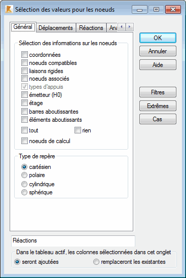 Le tableau peut présenter la liste des nœuds de calcul et les informations sur les barres et les éléments aboutissant au nœud :