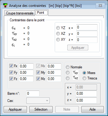 Sur l'onglet Point de la boîte de dialogue Analyse des contraintes, les contraintes extrêmes obtenues dans le point de la barre sélectionnée s’affichent.