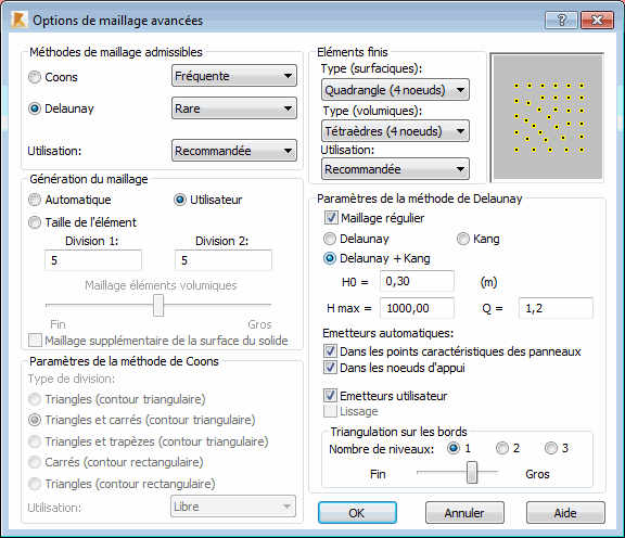 Dans la zone Paramètres de la méthode de Delaunay, vous pouvez sélectionner la méthode de génération du maillage :