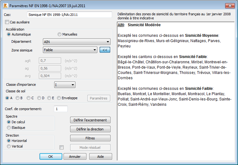 Lorsque vous sélectionnez cette norme, la génération de charges sismiques repose sur les dispositions provisoires de la norme NF EN 1998-1/NA:2010p, qui n'a pas encore été publiée.