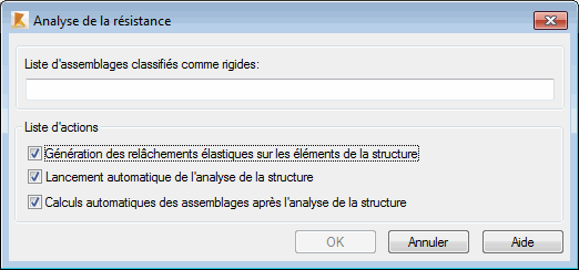 Après l’ouverture de la boîte de dialogue Analyse de la rigidité, le champ d’édition Liste d’assemblages classifiés comme rigides affiche le groupe des assemblages auxquels, pendant les calculs, le type d’assemblage semi-rigide a été affecté.
