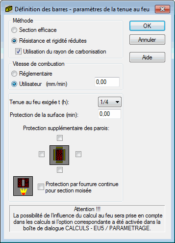 Remarque : Pour calculer les effets du feu, sélectionnez l'option Calculs avec la prise en compte de la possibilité de l'influence du calcul au feu dans la boîte de dialogue Configuration.