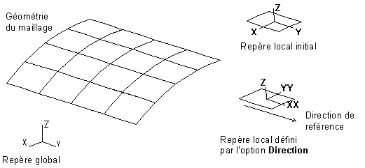 Les axes X et Y sont des axes locaux définis à l’aide de l’option Direction affichée dans l’onglet Détaillés. Cette option permet de définir la direction principale (axe x) du repère local à utiliser. Les valeurs des résultats pour tous les éléments sont recalculés pour le repère réorienté de cette façon. Vous pouvez définir la direction par un vecteur quelconque définissant la direction "principale" pour le calcul des résultats pour les éléments surfaciques, le vecteur en question est ensuite projeté sur l’élément pour définir la direction x locale, ce qui définit finalement la position de l’axe local x. Il existe une seule limitation pour la sélection de la direction : Le vecteur "principal" ne peut pas être normal à l’élément (c’est-à-dire parallèle à l’axe local z). Si l’utilisateur sélectionne cette direction, tous les résultats seront égaux à zéro.