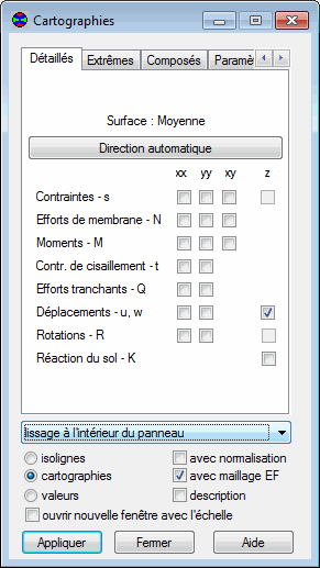 ou sélectionnez Résultats > Cartographies (panneaux) pour présenter les cartographies ou les isolignes des déplacements, moments et contraintes obtenus lors de l'analyse de la structure.