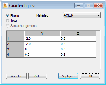 Utilisez le contour pour définir la surface de la section ou une ouverture dans la section définie (il est possible de définir une section en béton dans laquelle une section d'acier ou d'aluminium standard est disponible). Définissez les propriétés du contour sélectionné dans la boîte de dialogue Propriétés. La partie inférieure de la boîte de dialogue affiche un tableau dans lequel les coordonnées des points caractéristiques du contour sont présentées.