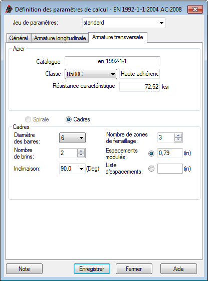 L'onglet Armature transversale permet de définir les paramètres des armatures transversales d'une barre BA conformément à la norme Eurocode 2 (ancienne version de la norme ENV 1992-1-1 avec des Documents d'Application Nationale différents et norme EN 1992-1-1:2004 avec des Annexes nationales différentes).