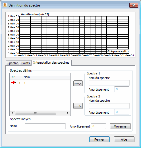 La partie supérieure de la boîte de dialogue affiche le repère dans lequel sont définis les spectres sélectionnés pour le spectre d'interpolation et le spectre résultant. Pour interpoler les spectres, procédez comme suit :
