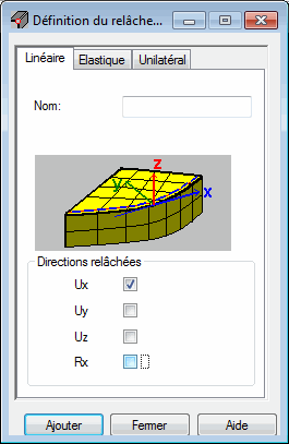 Après la sélection de l'onglet Linéaire, la boîte de dialogue Définition du relâchement prend l'aspect présenté sur la figure ci-dessous. Cet onglet contient les options qui servent à définir les directions relâchées.