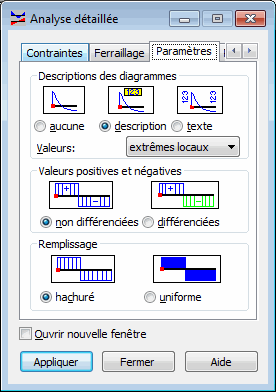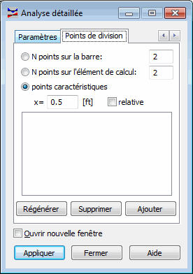 Les autres onglets de la boîte de dialogue Analyse détaillée permettent de définir le mode de présentation des grandeurs sélectionnées dans les diagrammes et les tableaux respectifs. Dans l’onglet Paramètres vous pouvez définir le mode de présentation des diagrammes à l’écran graphique. L’onglet Points de division permet de définir les points intermédiaires sur la barre pour lesquels les tableaux afficheront les valeurs des grandeurs à présenter.