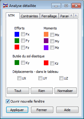 Dans l'onglet NTM de cette boîte de dialogue, l'option permettant de présenter la réaction du sol élastique pour les barres (options KY et KZ) est disponible. Les valeurs KY et KZ sont obtenues pour la réaction du sol élastique (R = K u, où R - force de réaction, K coefficient de butée du sol élastique, u déplacement) sur la longueur de la barre dans le repère local, si vous avez défini le sol élastique sur la barre.