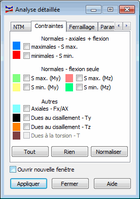 Sélectionnez Analyse détaillée pour choisir les grandeurs des barres sélectionnées dans une structure, ainsi que pour définir les paramètres de présentation des résultats.