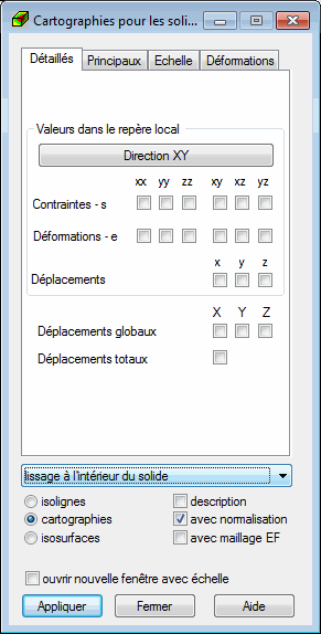 Dans cet onglet, vous pouvez sélectionner les valeurs suivantes pour la présentation des résultats : contraintes, déformations et déplacements. Vous ne pouvez sélectionner qu'une seule valeur sur tous les onglets.