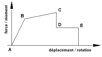 Nom du modèle affiche le nom du modèle de rotule sélectionné. Dans le tableau, vous pouvez définir ou modifier les points du diagramme déplacement - force ou moment - rotation. Les coordonnées des points suivants doivent être définies une par une : E(-), D(-), C(-), B(-), A, B, C, D, E. L’image suivante montre la partie positive d’un diagramme.