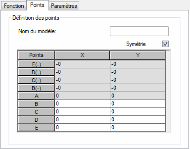 Le fait de sélectionner Symétrie ne définit que la partie positive d’un diagramme (c’est-à-dire que les coordonnées des points B, C, D et E doivent être spécifiées). Les coordonnées des points B(-), C(-), D(-) et E(-) seront automatiquement saisies dans les champs appropriés du tableau.