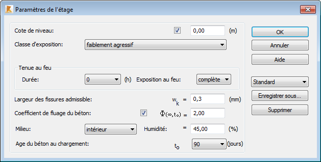 La boîte de dialogue Paramètres de l'étage permet de définir les paramètres caractéristiques d'un étage conformément à la norme britannique (BS 8110).