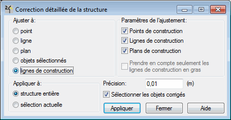 Deux options sont disponibles au bas de la boîte de dialogue : Structure entière ou Sélection actuelle. Elles définissent le champ d'application de la correction de la structure. En outre, la précision peut être déterminée. Il s'agit d'une valeur de distance qui définit l'intervalle dans lequel les corrections nécessaires pour une structure sont effectuées. Ces corrections sont effectuées uniquement lorsque la distance est inférieure à la précision. Si l'option Sélectionner les objets corrigés est sélectionnée, le modèle est alors corrigé et les objets (barres, panneaux, etc.) dans la zone de dessin, dont la géométrie a été modifiée, sont sélectionnés.