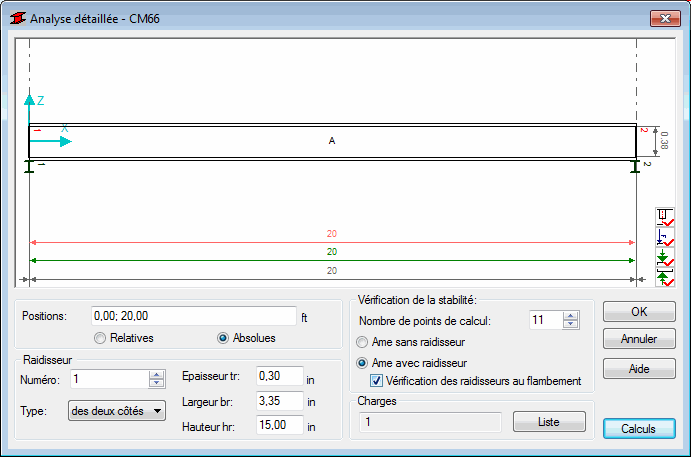 L’analyse détaillée de la barre est lancée après un clic sur le bouton Détaillé disponible dans la boîte de dialogue des résultats détaillés pour la norme acier française CM66.