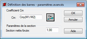Cette option sert à définir les paramètres réglementaires avancés du type de barre acier. Pour accéder aux paramètres, cliquez sur le bouton Plus situé dans la boîte de dialogue Définition des barres - paramètres.