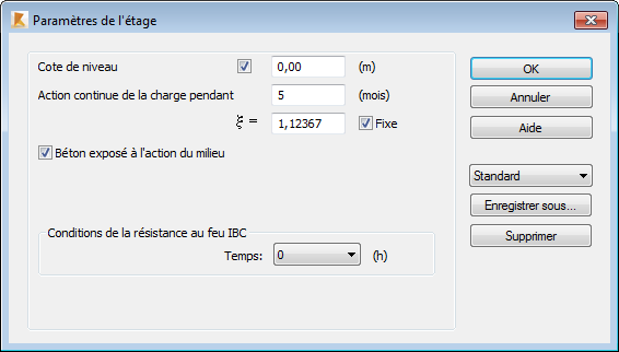 - ksi : coefficient utilisé dans les calculs de la flèche de longue durée (ACI318/99 – p.9.5.2.5) ; il est calculé automatiquement à partir du temps d'action de la charge de longue durée. Il peut être entré manuellement après sélection de l'option Fixe et saisie de la valeur du coefficient.