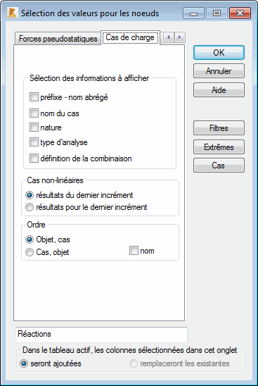 Dans le champ Sélection des informations à afficher, vous pouvez sélectionner les éléments suivants : préfixe (nom abrégé d'un cas), nom du cas, nature du cas, type d'analyse (linéaire, non linéaire, de flambement, etc.) et définition de la combinaison.