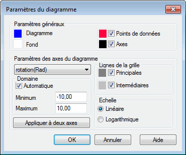 Cette option sert à définir les paramètres du diagramme présenté dans la partie supérieure de la boîte de dialogue Définition du modèle de rotule ou Définir le modèle de non-linéarité. Ouvrez la boîte de dialogue Paramètres du diagrammes en cliquant avec le bouton droit de la souris dans le diagramme et en sélectionnant Paramètres du diagrammes dans le menu contextuel.