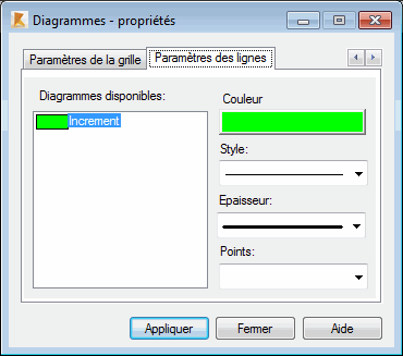 Les options contenues dans cette boîte de dialogue permettent de définir les paramètres de la ligne présentant les diagrammes définis. Le champ Diagrammes disponibles présente toutes les grandeurs sur l'axe Y. Pour chaque diagramme, les options suivantes sont disponibles :