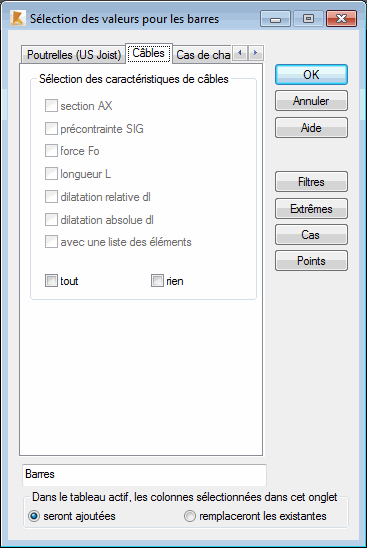 Dans la boîte de dialogue Colonnes, cliquez sur l'onglet Câbles pour sélectionner les valeurs de câbles à afficher.
