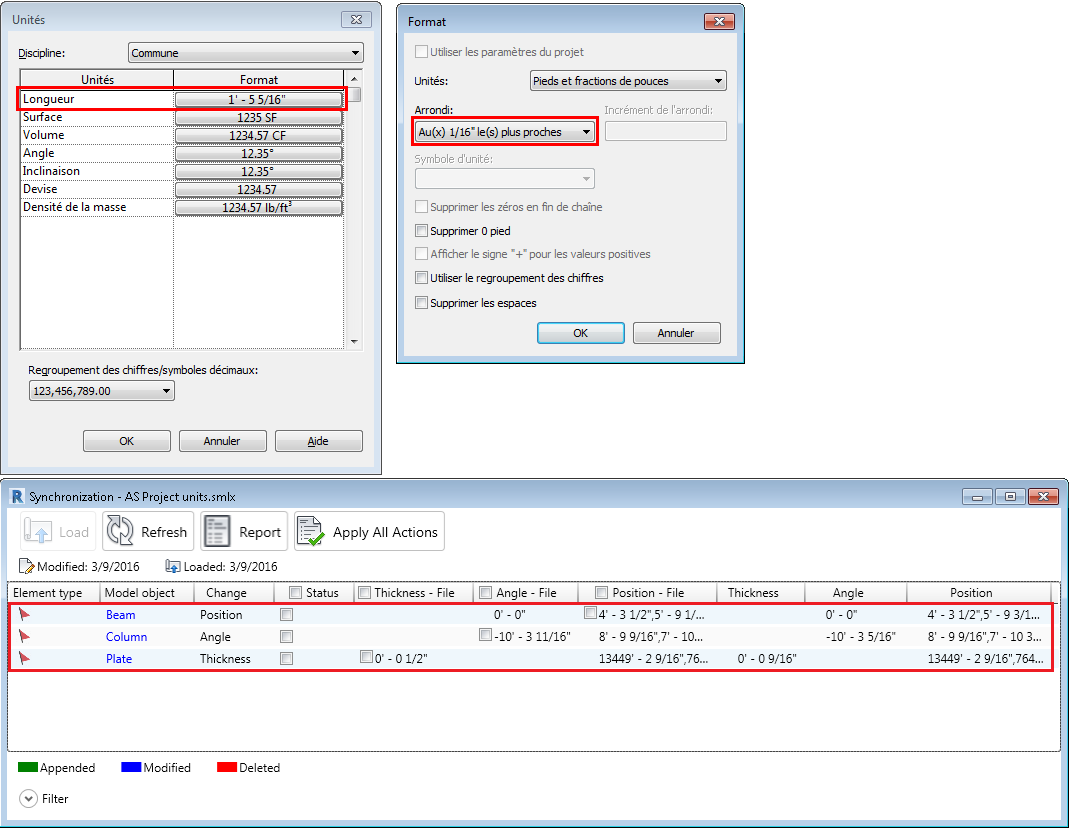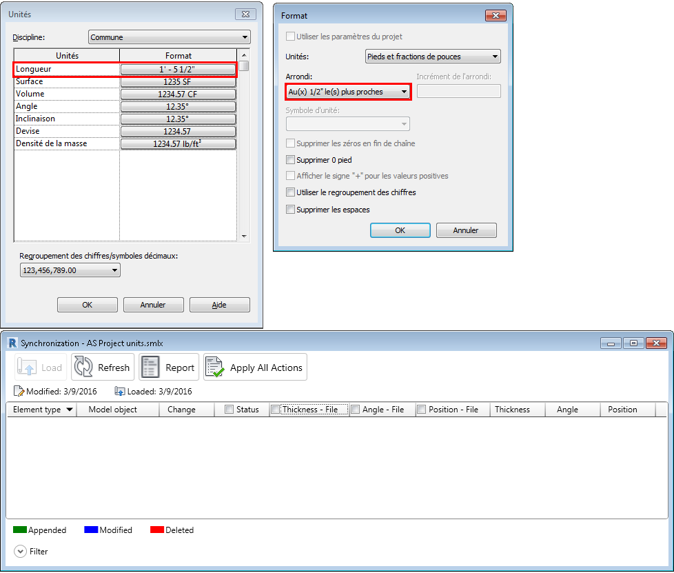 La boîte de dialogue Synchronisation fonctionne avec les unités de mesure et les tolérances définies dans la boîte de dialogue Unités de Revit.