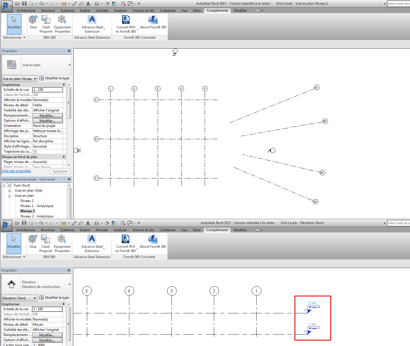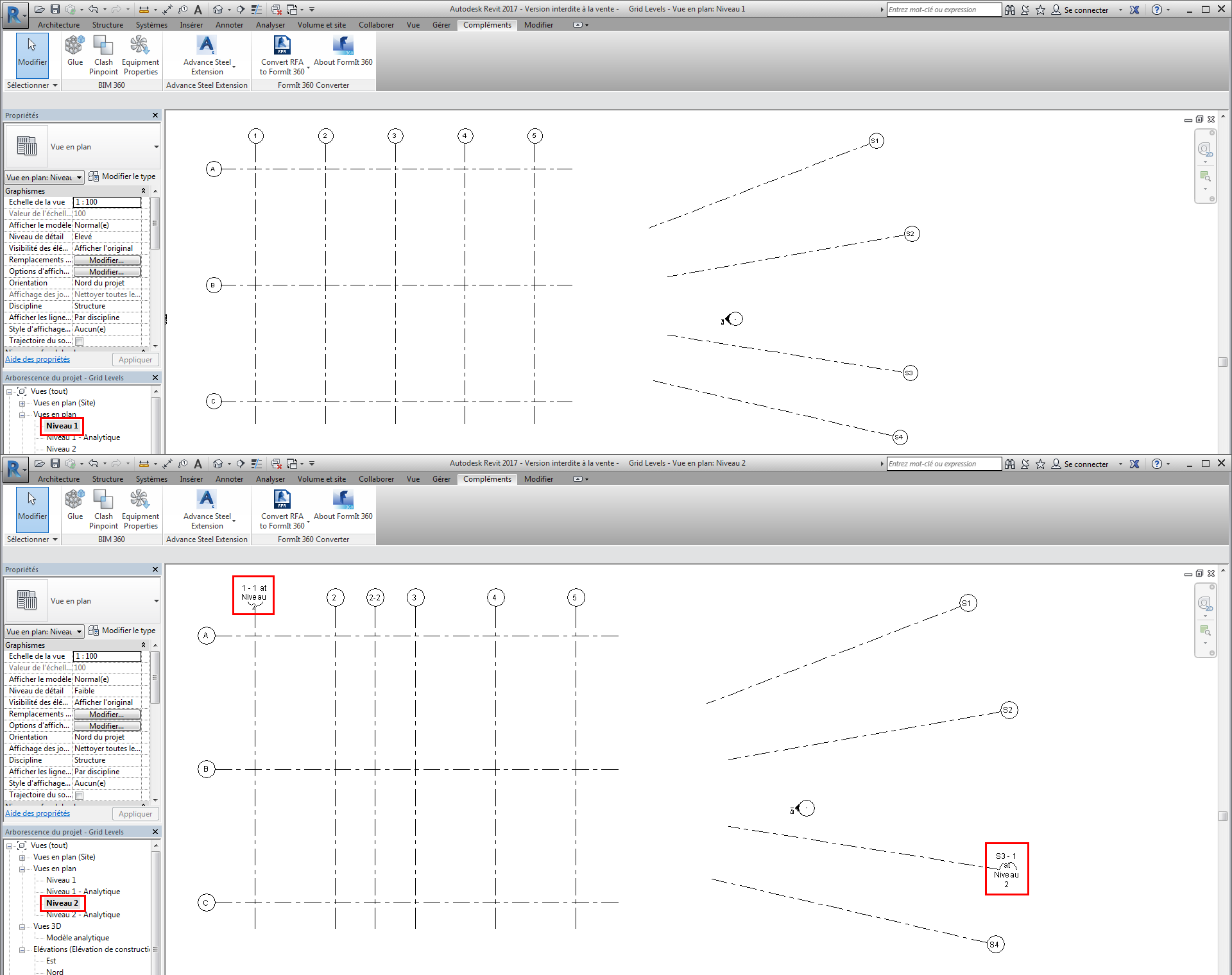 Dans l'exemple suivant, il existe un quadrillage créé dans Revit, visible sur le Niveau 1 et le Niveau 2 :