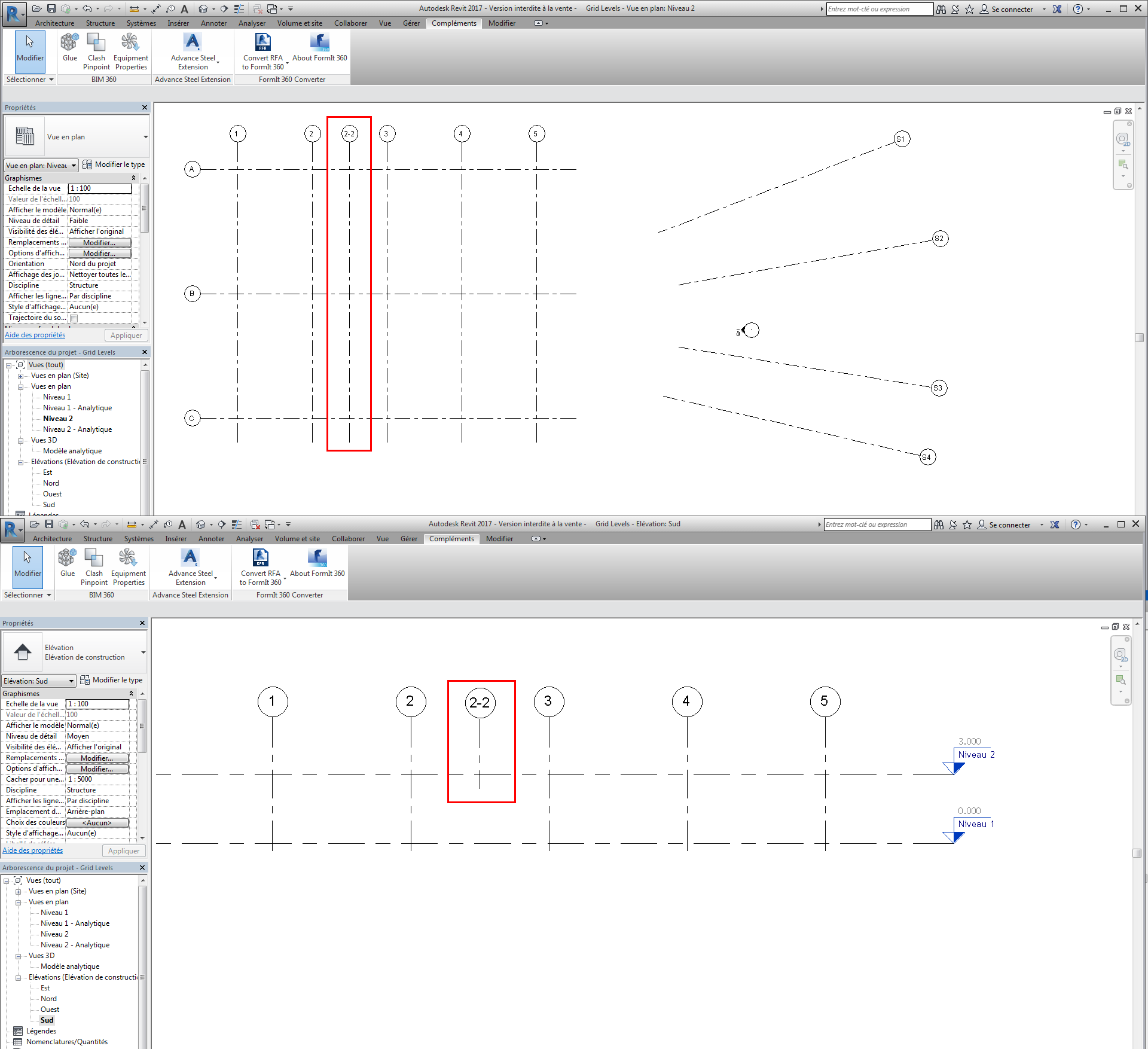 Si un quadrillage supplémentaire est créé dans Revit (par ex. 2-2), uniquement visible sur le Niveau 2, et s'il est exporté dans un fichier .smlx et synchronisé dans Advance Steel, le quadrillage sera créé sur le niveau inférieur :
