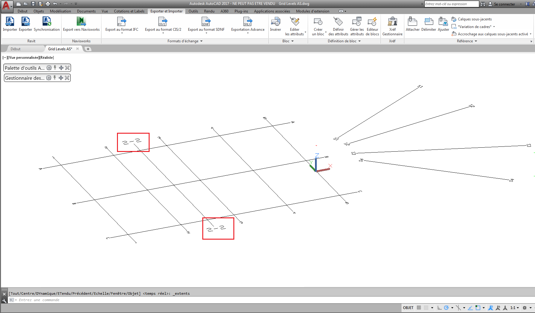 Revit permet uniquement d'exporter les axes de quadrillage sur le Niveau de base - Elévation 0. Les axes de quadrillage des autres niveaux seront projetés dans le niveau de base. Lors de l'importation ou de la synchronisation d'un fichier .smlx Revit dans Advance Steel, tous les quadrillages seront créés dans la coordonnée Z = 0 du SCG.