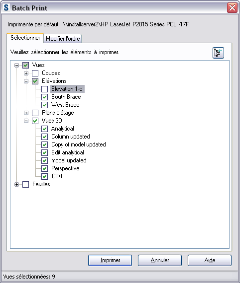 L'onglet Sélectionner de la boîte de dialogue Batch Print répertorie l'ensemble des vues, des feuilles et des jeux de vues/feuilles (collectivement appelés dessins) du projet Revit courant. Les dessins sont répertoriés selon la même hiérarchie que celle de l'arborescence du projet Revit.