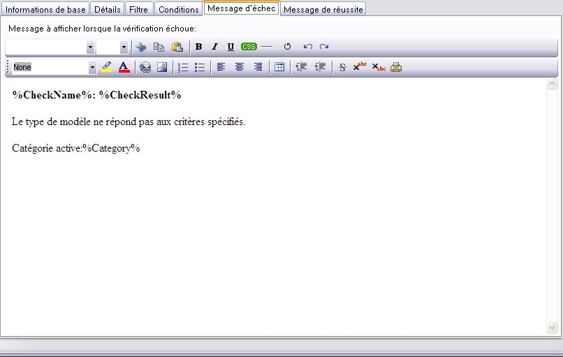 Dans Model Review, l'onglet Message d'échec contrôle le message qui s'affiche dans Results Browser lorsqu'une vérification exécutée ne répond pas aux critères donnés.