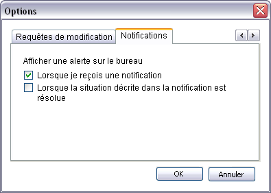 Choisissez une option pour indiquer que vous souhaitez recevoir des alertes sur le bureau lorsque Worksharing Monitor émet une notification ou en cas de résolution d'un problème. Désactivez une option afin d'éviter la réception de ces alertes de bureau.