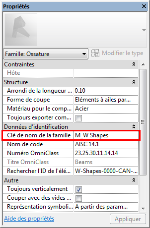 Le paramètre Identifiant du nom de la famille est associé au nom de la table d'Advance Steel dans une correspondance de type 1 à 1. Ce paramètre est stocké dans la famille.